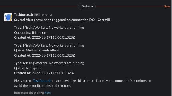 That's all, from now on, every time an alert is produced you will get a message on the given slack channel: