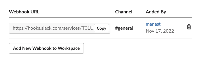 Your hook URL will now appear on the list of Webhook URLs