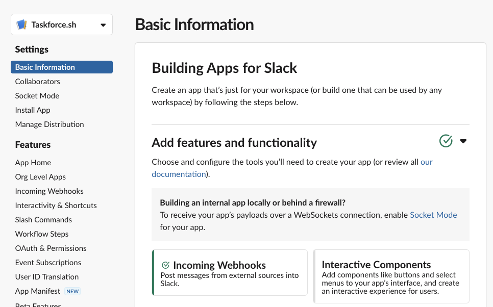 Start by going to [api.slack.com](https://api.slack.com) and select an existing App or create a specific App to be used for Taskforce.sh: